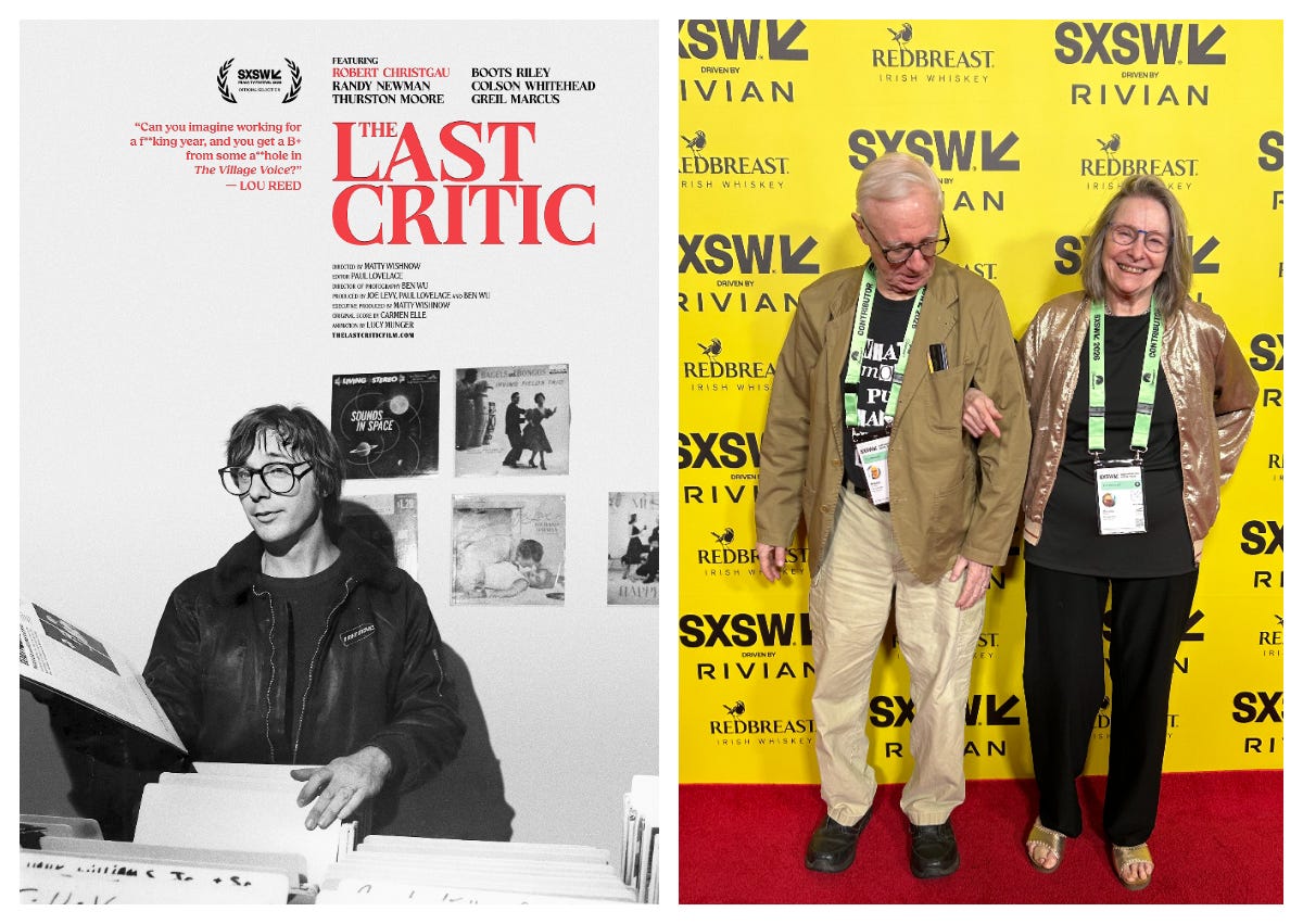As someone who turns 84 in a month, my appetite for long-distance travel has shrunk close to zero, not just because airfare is so pricey (and getting pricier thanks to Trump’s war in Iran) but because the whole rigmarole has so many wearying drawbacks and complications. Speaking of which, so do festivals, conventions, and other such socioprofessional aggregations. But this year’s Austin, Texas, SXSW—in case you didn’t know, that means South by Southwest, one of the biggest—beckoned pretty much irresistibly because I myself was a featured attraction as the subject of a documentary called The Last Critic that would premier there. The nearly 90 minute doc is the work of a trio of Austinites: director Matty Wishnow, director of photography Bun Wu, and editor Paul Lovelace, the latter of whom had worked as my assistant and done a student doc about me at NYU in the late ‘90s. Carola and I couldn’t resist, especially with And It Don’t Stop editor and doc co-producer Joe Levy providing support. Carola even bought a gold bomber jacket for the occasion. Looked great.